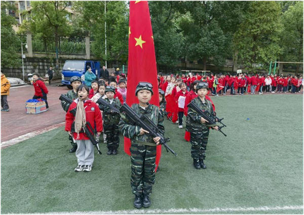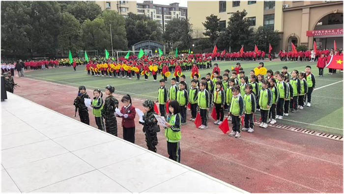 幼稚披彩,声震操场。近日,在自贡燊海丛林小学畅通会开幕式,二年事4班的迷彩方阵如一束酷热的星火,遽然点亮全场。孩子们身陶醉彩服,手抓橡胶枪,迈着整王人步骤走过主席台,威望澎湃,仿若肩扛责任的“小战士”。